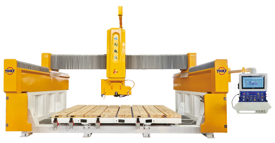 Deze machine is een speciaal ontworpen 5-assige brugzaagmachine, ontworpen voor het nauwkeurig zagen en profileren van standaardplaten en complexe, onregelmatige vormen. Het is in staat om een breed scala aan geometrieën te verwerken, waaronder polygonen, driehoeken, waaiervormen, werkbladen, ellipsen, diamanten, cirkels, bullnose randen, afschuiningen onder willekeurige hoeken, evenals rechte en gebogen lijnen. Met zijn hoge zaagsnelheid, uitzonderlijke precisie en gebruiksvriendelijke bediening is het ideaal voor het verwerken van materialen zoals sintered stone, marmer, graniet, kwartssteen en andere onregelmatige of op maat gemaakte werkstukken.